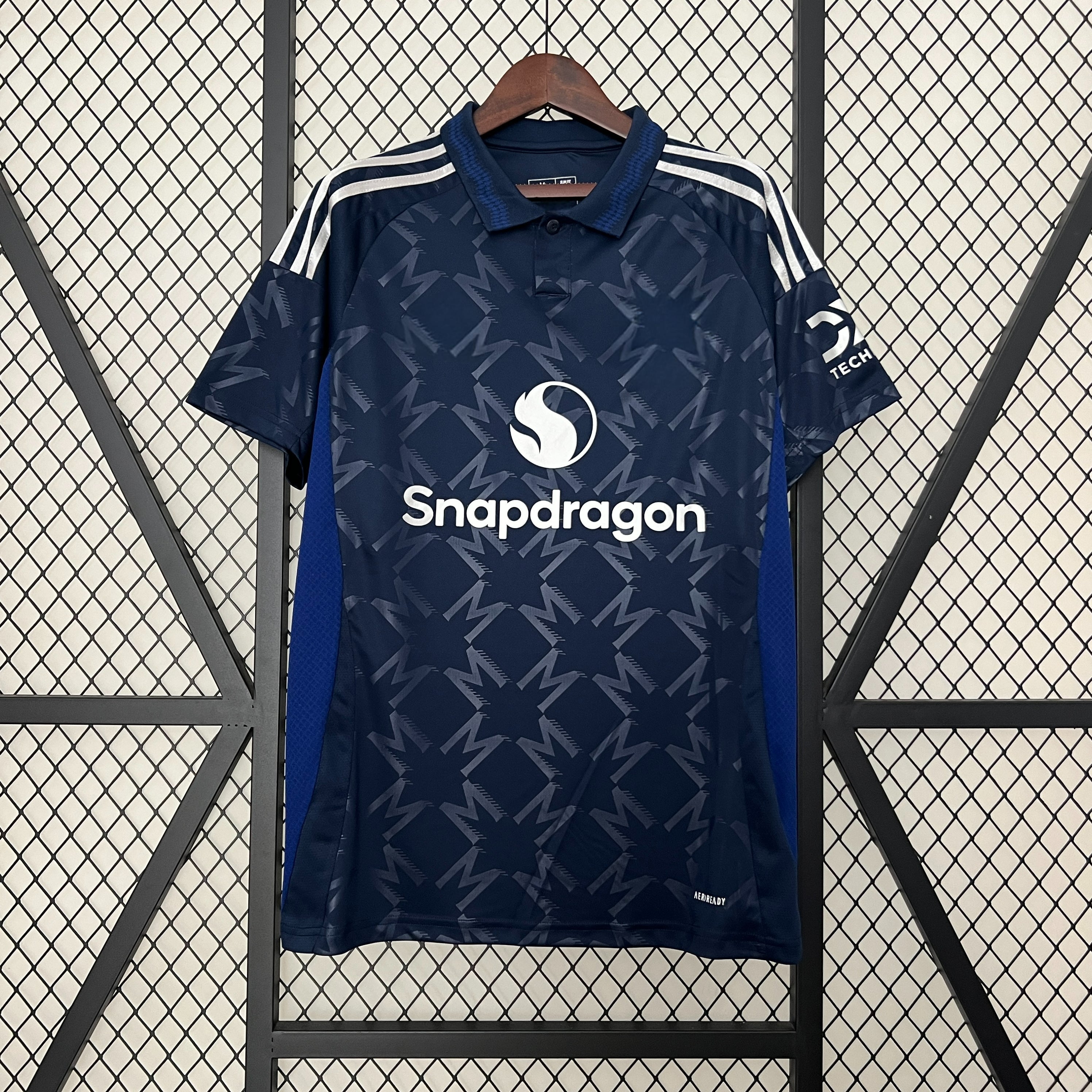 Destaque visual: camisola alternativa em azul‑escuro com padrão geométrico ton-sur-ton que forma um motivo em "M", gola tipo polo e riscas brancas nos ombros. Logótipo do patrocinador em branco ao centro e emblema discreto no peito realçam o estilo.