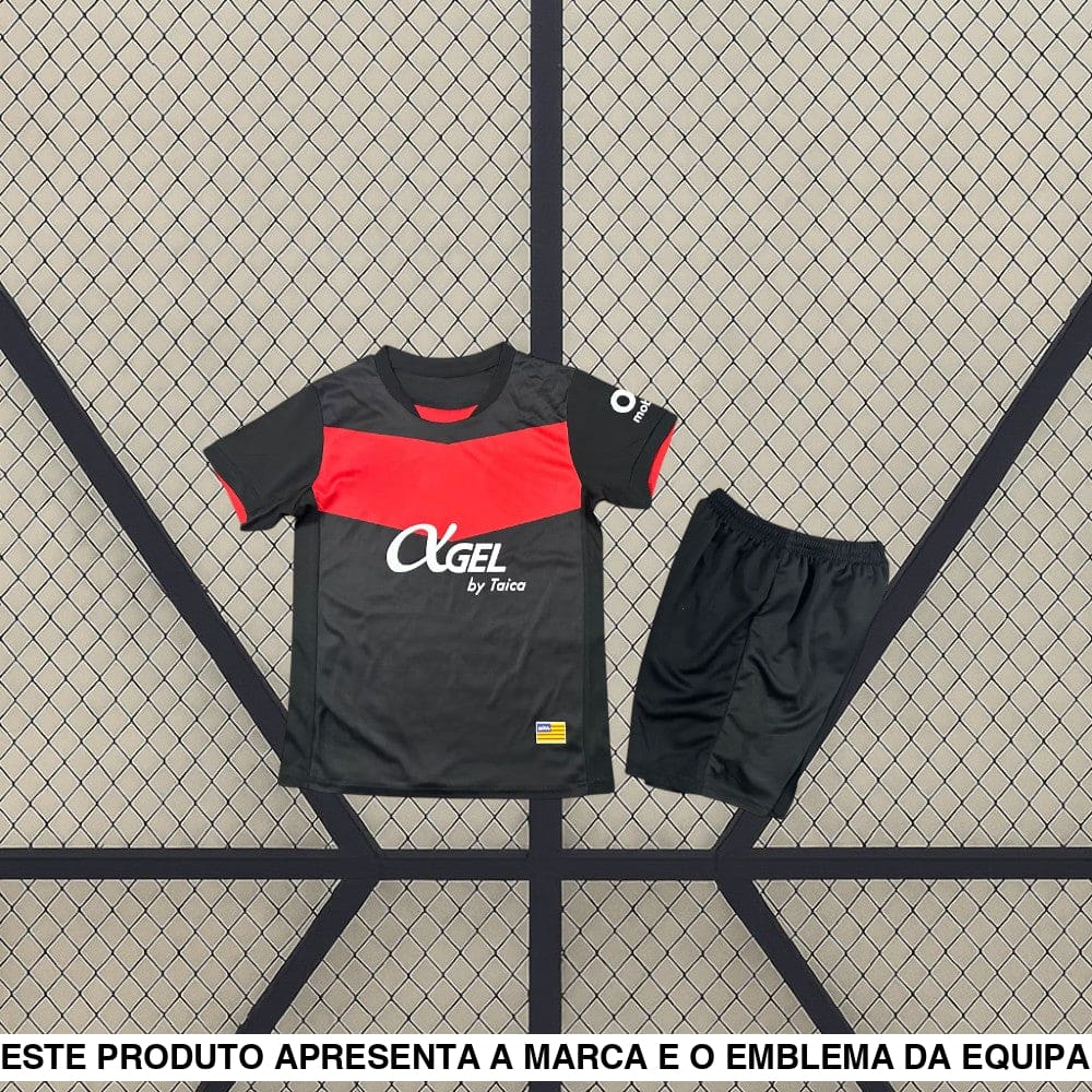 Design: equipamento infantil em versão adepto, com cores vibrantes e contrastantes, escudo e logótipo em destaque para um visual marcante e cheio de identidade.