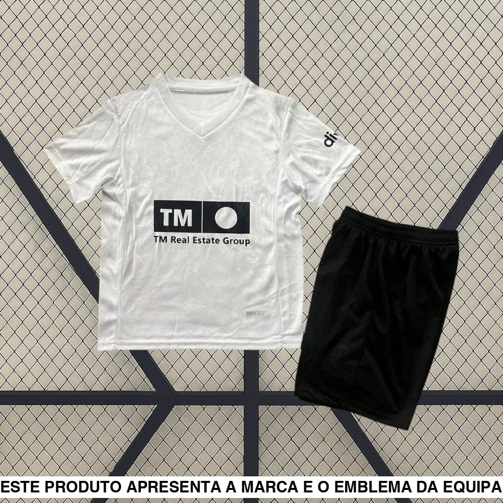 Visual impactante: conjunto infantil em branco com mangas e detalhes a preto e apontamentos dourados, com o escudo e os logótipos bem visíveis ao peito e na perna — estilo clássico de campo que ressalta paixão e identidade.
