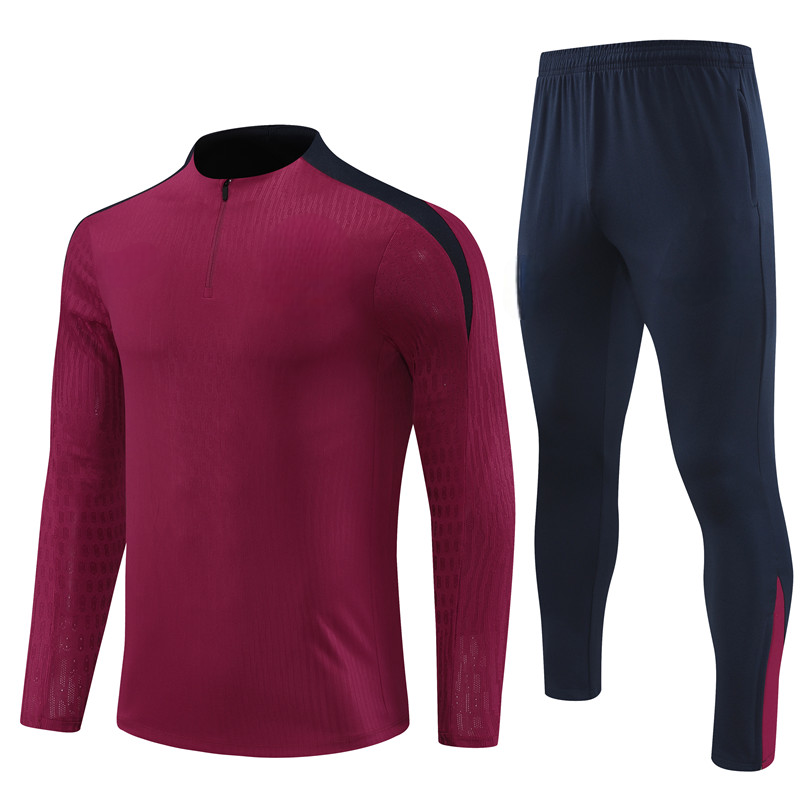 Design e cores: corte com meio fecho, parte superior em vinho intenso com detalhe azul‑marinho nos ombros e calças azul‑marinho com apontamentos vinho junto aos tornozelos; emblema e logótipo alusivos à seleção inglesa realçam o estilo futebolístico.